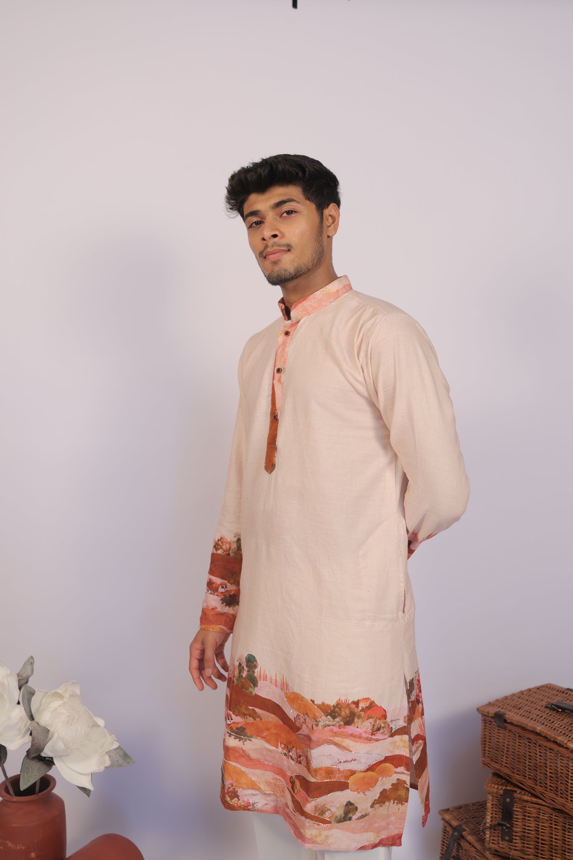 Pair the Dawnridge Canopy Kurta with churidars, straight pants, or tailored trousers for a look that transitions seamlessly from traditional to modern.